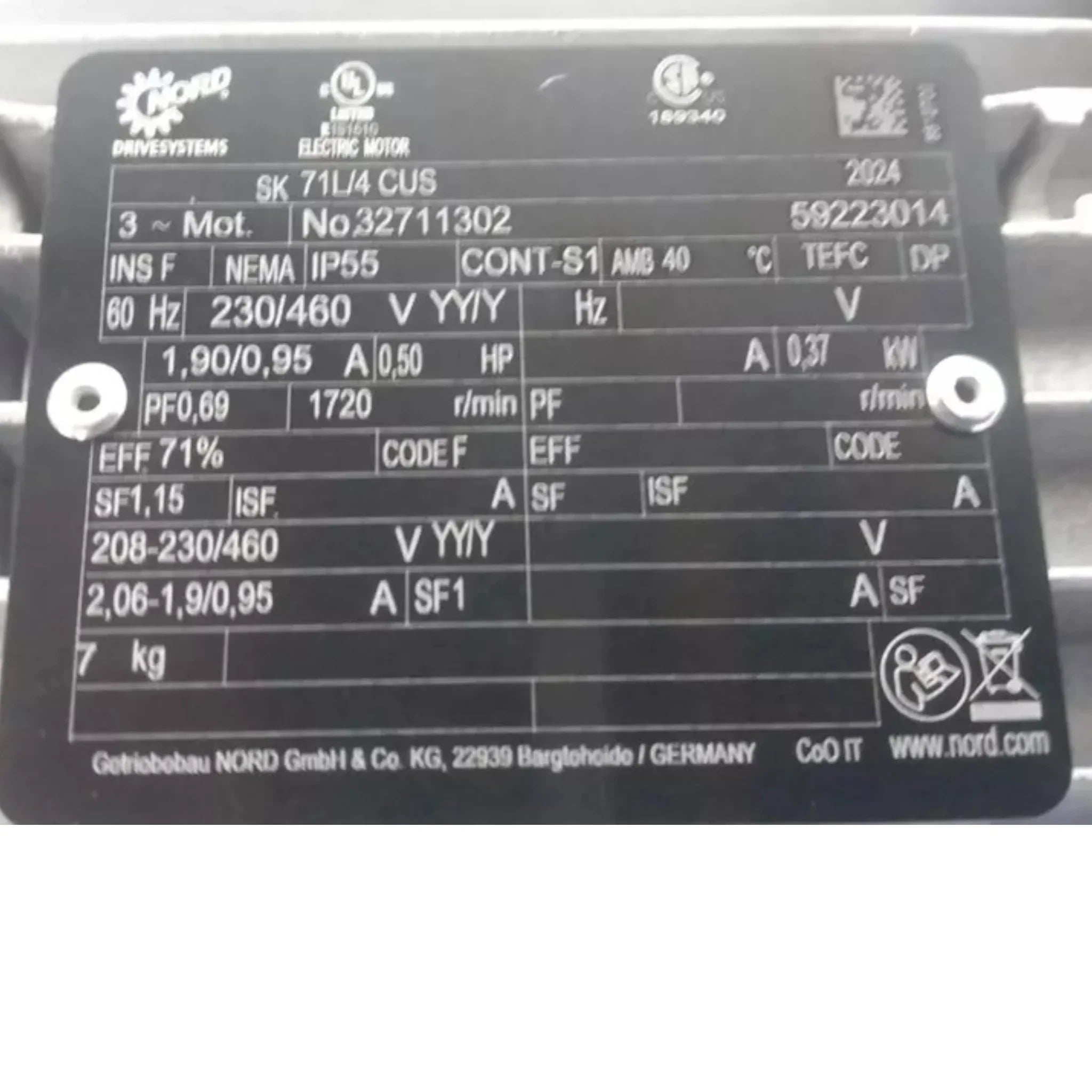 SK372.1-71L/4 60.83 Nord AC Gearmotor 0.5 Input HP 28 RPM 230/460VAC