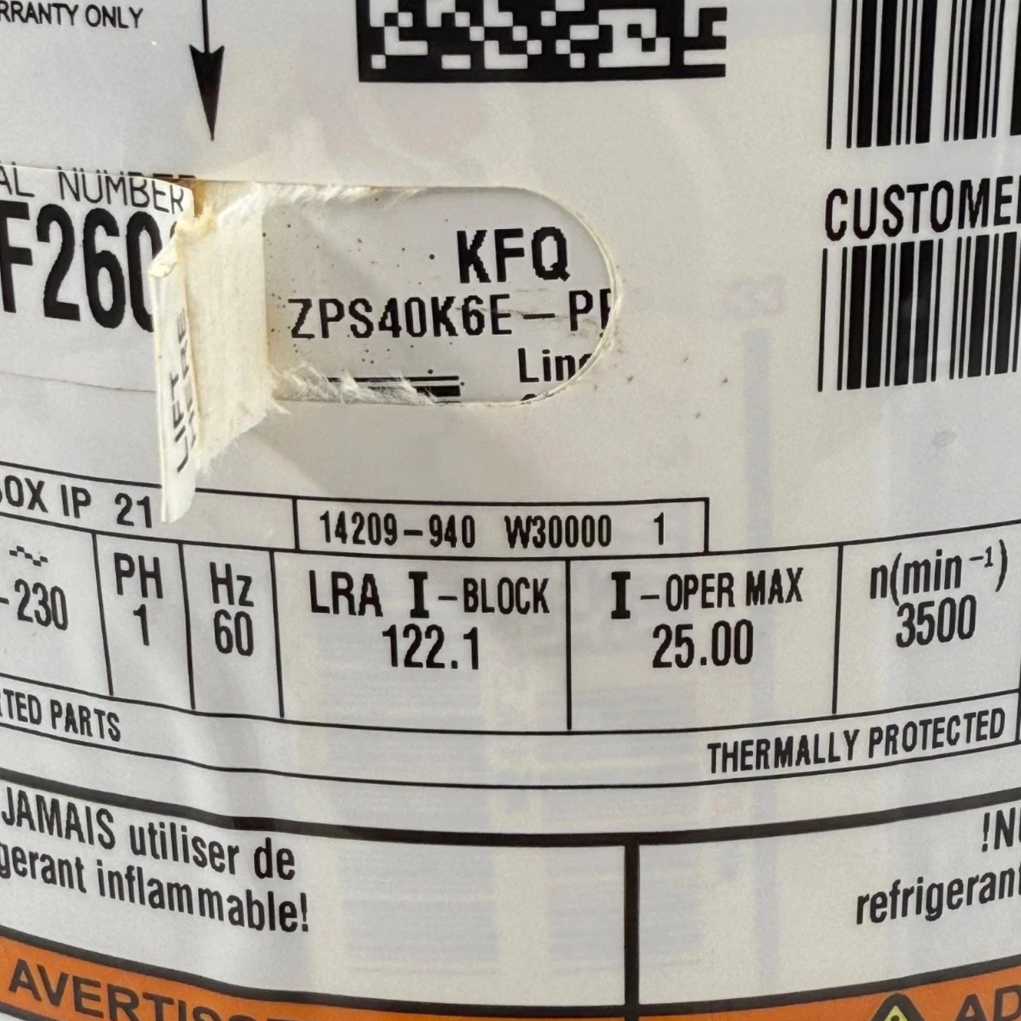 Description: Compressor 208-230V 1PH 60HZ (No Core Charge)